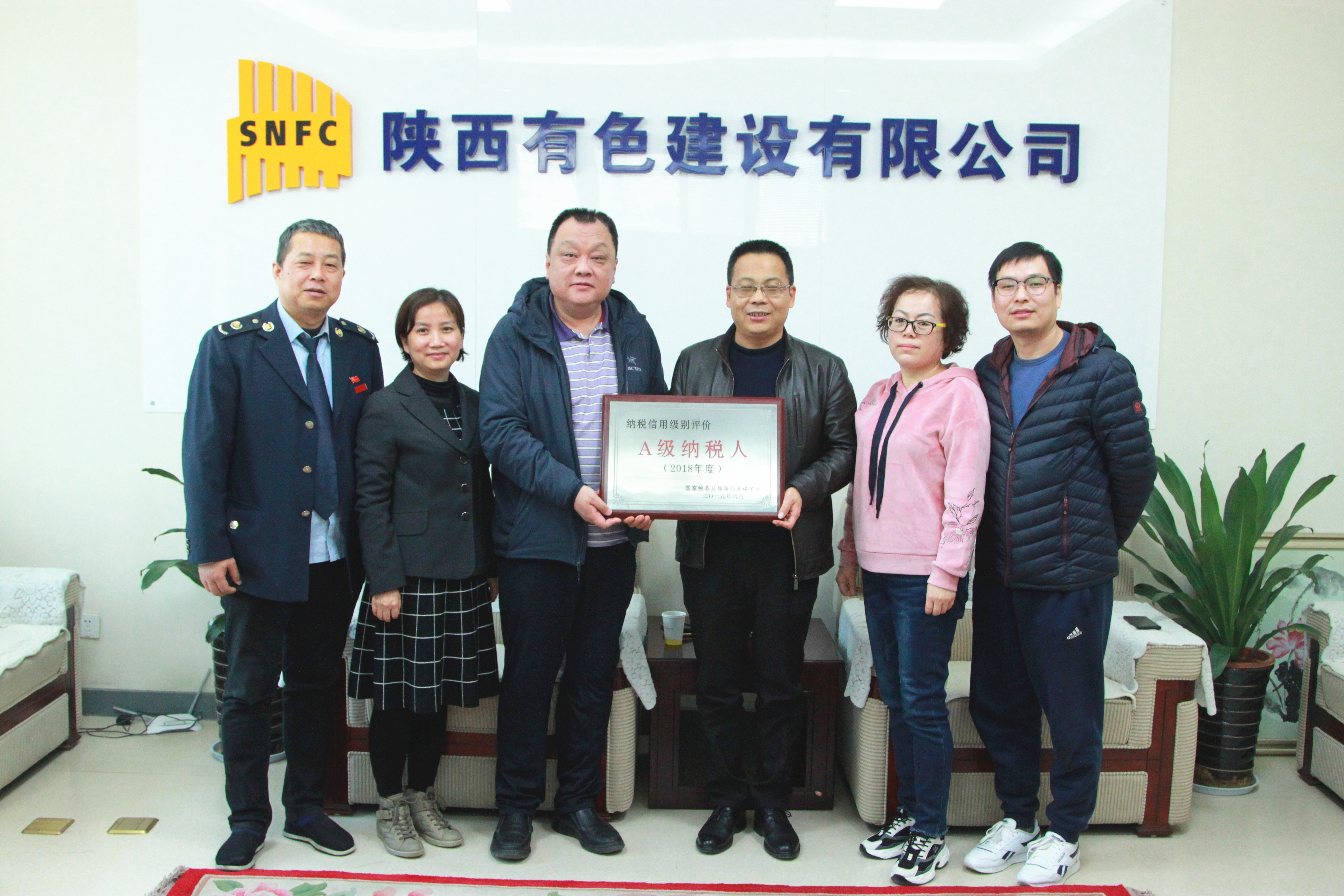 12月5日,碑林區稅務局第六稅務所高曉成所長前往公司頒發2018年度A級納稅人的獎牌,總會計師陳毓代表公司領獎。至此公司已連續兩年獲此殊榮。