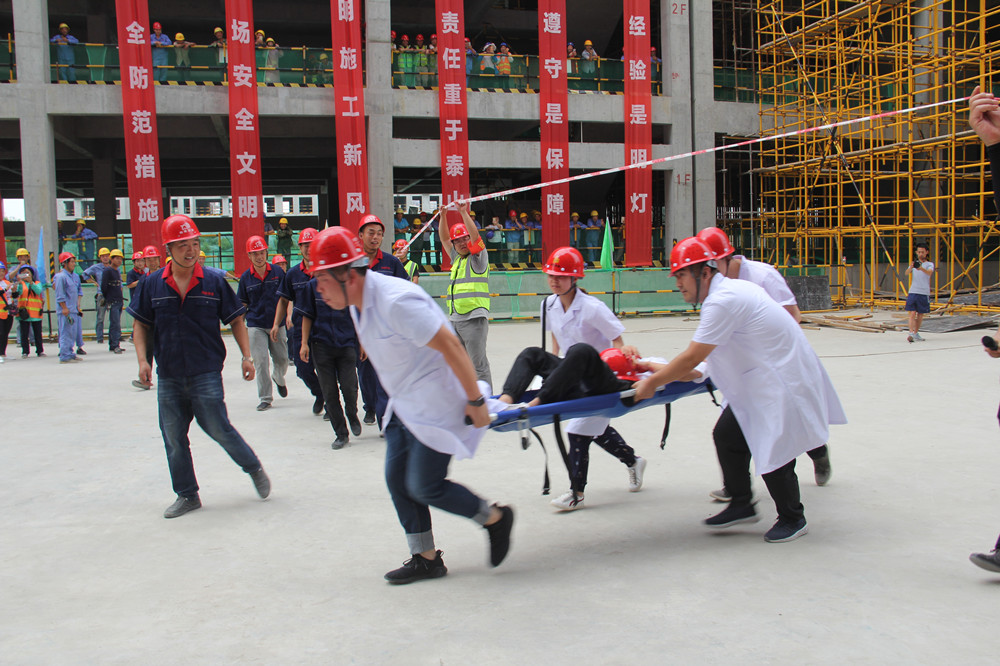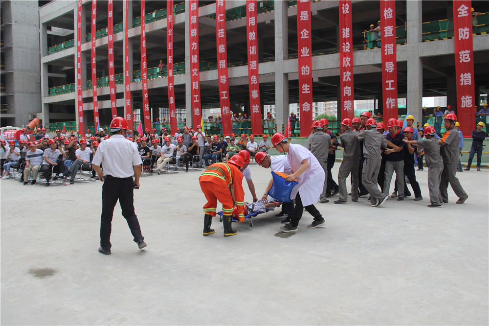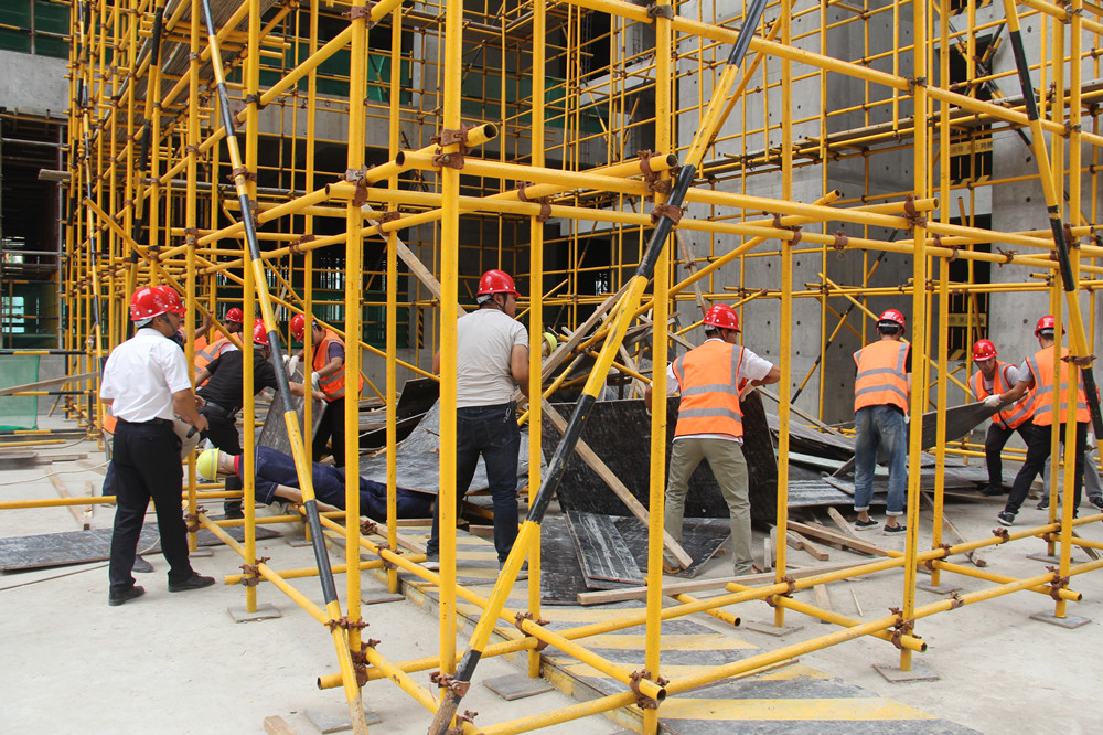 上午10:00整,隨著公司總經理楊明鈺的一聲令下,演練正式開始。本次高支模腳手架坍塌應急演練主要模擬:2#商業屋面支設模板時,由于工人在架體沒有加固完成及驗收合格的情況下擅自作業,導致坍塌事故,造成1名作業人員從工作面墜落,1名架體加固工人被掩埋。事故發生后,現場安全員發現情況后立刻按照國家《生產安全事故報告和調查處理條例》及《安全生產法》的有關規定,向項目負責人進行匯報,項目負責人立即啟動《應急救援預案》,一邊組織應急救援小組迅速開展自救,一邊向公司領導報告,并第一時間請求120、119等政府救援力量救援。接到險情后,公司生產運行部經理張輝帶領公司應急救援小組相關人員前往現場,指導救援工作。項目部應急救援小組有序展開救援,搶險組迅速進入現場清理雜物,排查危險源防止二次傷害發生;疏導組疏導事故周邊交通,指引救援車輛進入事發現場;醫療組在事故現場對一名傷員進行了緊急救助,并將傷者移往安全地帶,隨即趕來的119、120人員,營救了傷勢嚴重的另外一名工人;警戒組第一時間在現場設置了警戒線,維持現場秩序;調查組進入事發現場對此次事故發生的原因展開調查,收集資料,模擬演練完畢。