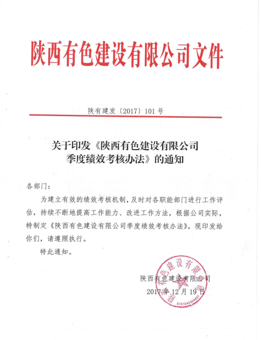 為建立有效的績效考核機(jī)制,實(shí)現(xiàn)績效考核逐步向績效管理轉(zhuǎn)變,公司人力資源部經(jīng)過認(rèn)真分析調(diào)研,根據(jù)公司實(shí)際情況,制定出臺(tái)了《陜西有色建設(shè)有限公司季度績效考核辦法》,經(jīng)公司董事長辦公會(huì)研究通過,于今年1月1日起正式實(shí)施。